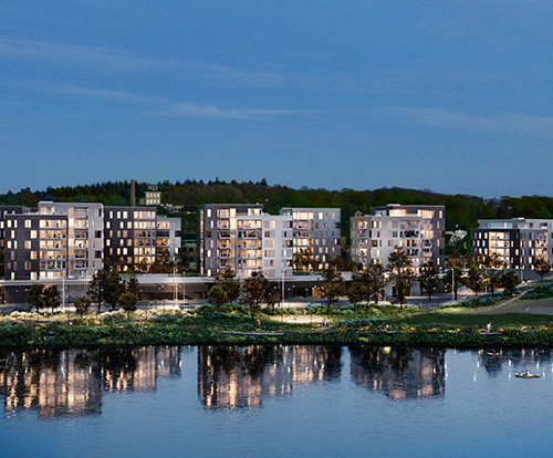 Den synlige beliggenhed ved søerne, kørende trafik, lettilgængelige p-pladser, Remstrup Å og en helt ny bypark giver en optimal placering midt i Silkeborg. Samtidig får man del i en eksklusiv, udadvendt arkitektur, der åbner sig mod byens liv.